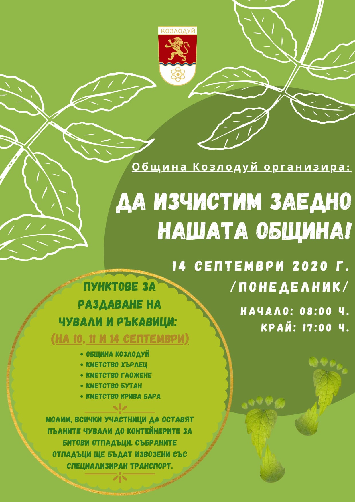 Всички граждани на общината, които искат да се включат в инициативата, могат да получат безплатни чували и ръкавици за събиране на отпадъци на 10, 11 и 14 септември, в периода от 08:00 ч. до 17:00 ч., на място, в сградата на Общината или от съответното кметство.