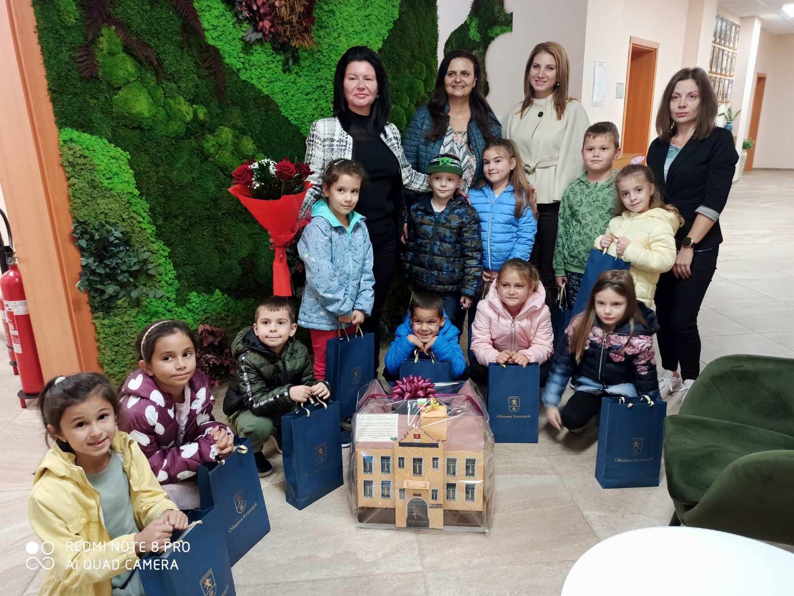 Децата от група „Калинка” поднесоха на кмета Маринела Николова, цветя и макет на сградата на общината. Макетът е изработен съвместно с родителите и малките на тема „Моят роден град – забележителности” от рециклирани отпадъчни материали и пресъздава сградата в детайли. Кметът им подари символични подаръци, като им пожела един ден да имат възможността да работят в Община Козлодуй.