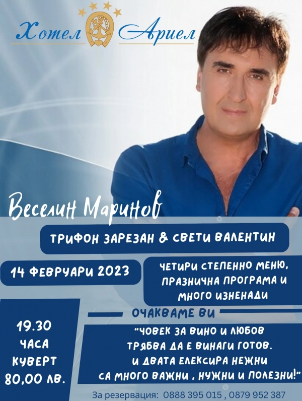 Заповядайте на празника на любовта и виното в Хотелски комплекс „Ариел” град Мездра. За доброто настроение на присъстващите ще се погрижи Веселин Маринов. Той ще изпее едни от най-хубавите си песни. Кувертът за 14 февруари е 80 лв. Включва 4-степенно меню, празнична програма и много изненади за гостите.