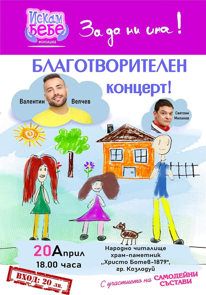 Искам бебе - Северозападна България кани всички жители и гости на гр. Козлодуй на благотворителното събитие "За да ни има!"В рамките на цялото меропириятие ще се организират благотворителен базар и благотворителен концерт в подкрепа на хора с репродуктивни проблеми от гр. Козлодуй и региона.