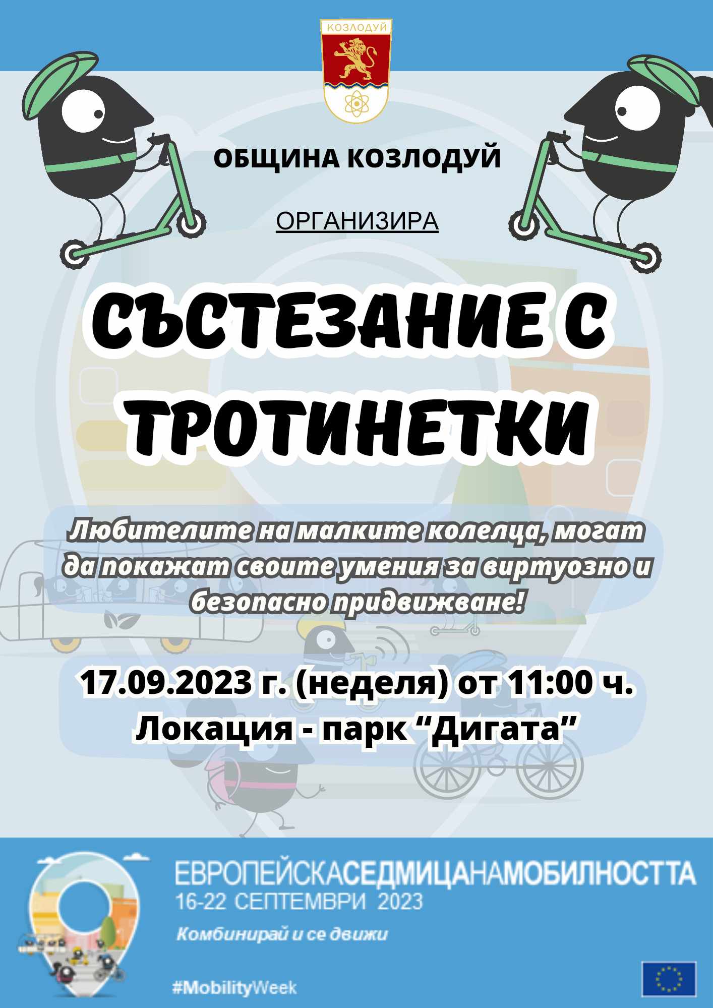 Демонстрационно състезание с тротинетки ще се проведе на 17 септември от 11 часа в парк Дигата в Козлодуй. Проявата е част от европейската седмица на мобилността. Любителите на малките колелца ще могат да покажат своите умения за виртуозно и безопасно придвижване. Освен майсторство, състезателите трябва да покажат бързина и прецизност при преодоляване на препятствията по трасето, включващи преминаване през ограничителна рамка, слалом между конуси и преодоляване на други предизвикателства. Записването за участие в състезанието ще става на място, като за всеки участник ще има предоставен индивидуален номер за участие. Всички участници трябва да бъдат внимателни и да познават и спазват пътните знаци. Най-добре представилите се ще получат награди.