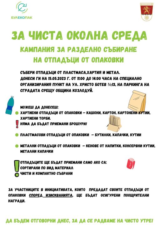 На 15-ти май, от 11 до 14 часа, на паркинга пред сградата на община Козлодуй ще се проведе информационна кампания на тема „Разделно събиране на отпадъци от опаковки.”