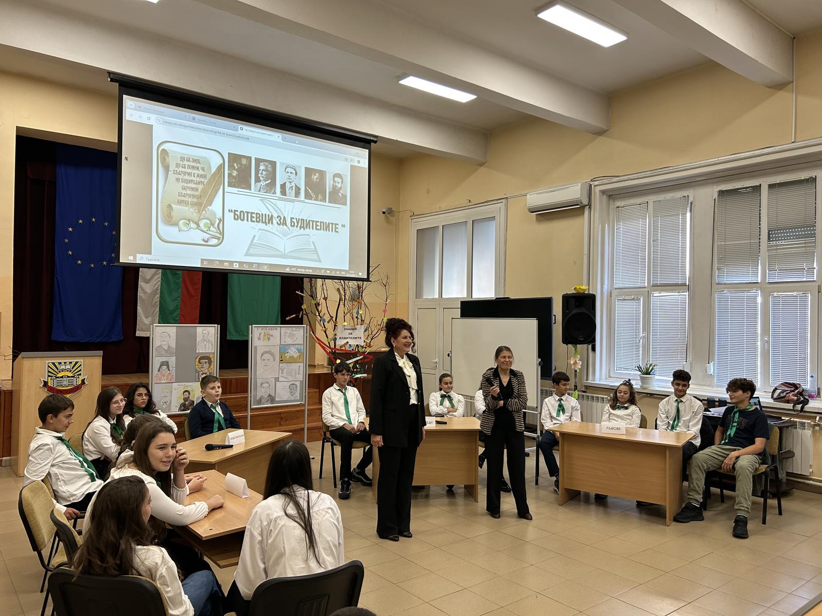 Във вторник се проведе историческото състезание "Ботевци за будителите", на което показаха своите знания 4 отбора сформирани от шестите и седмите класове. "Ботевци", "Лъвовете", "Историците" и "Любознателните" в първи кръг отговаряха на въпроси, свързани с народните будители, във втори кръг посочваха местоположенито на емблематични населени места и обекти изиграли важна роля през различните епохи за съхраняване и развитие на българския национален дух и култура. В следващия кръг учениците трябваше да подредят пъзел с изображението на паметници в родния ни град и да разкажат за претворените в тях образи на светите братя Кирил и Методий, скулптура Андрей Николов, актьора и режисьор Людмил Кирков и нашия патрон - Христо Ботев, чийто паметник се намира в двора на училището ни. Заключителният кръг беше посветен на стиховете, достоен емоционален завършек на своеобразната "среща" с народните будители. Жури на състезанието беше в състав: председател Цветелина Ценова – Костадинова, старши експерт ОНГОР и членове Славея Петрова, учител по история и цивилизации в гимназиален етап на обучение и Анита Йотова, ученичка от 11.а клас, профил "Обществени науки". Докато журито заседаваше учениците от ЦОУД - 5 и 6 клас представиха имена и мисли на народни будители, които бяха написали на свитъци и поставили на дървото на "Знание за народните будители". Представени бяха и две табла с тематични рисунки, подготвени в часовете по изобразително изкуство под ръководството на Самуил Стоянов.