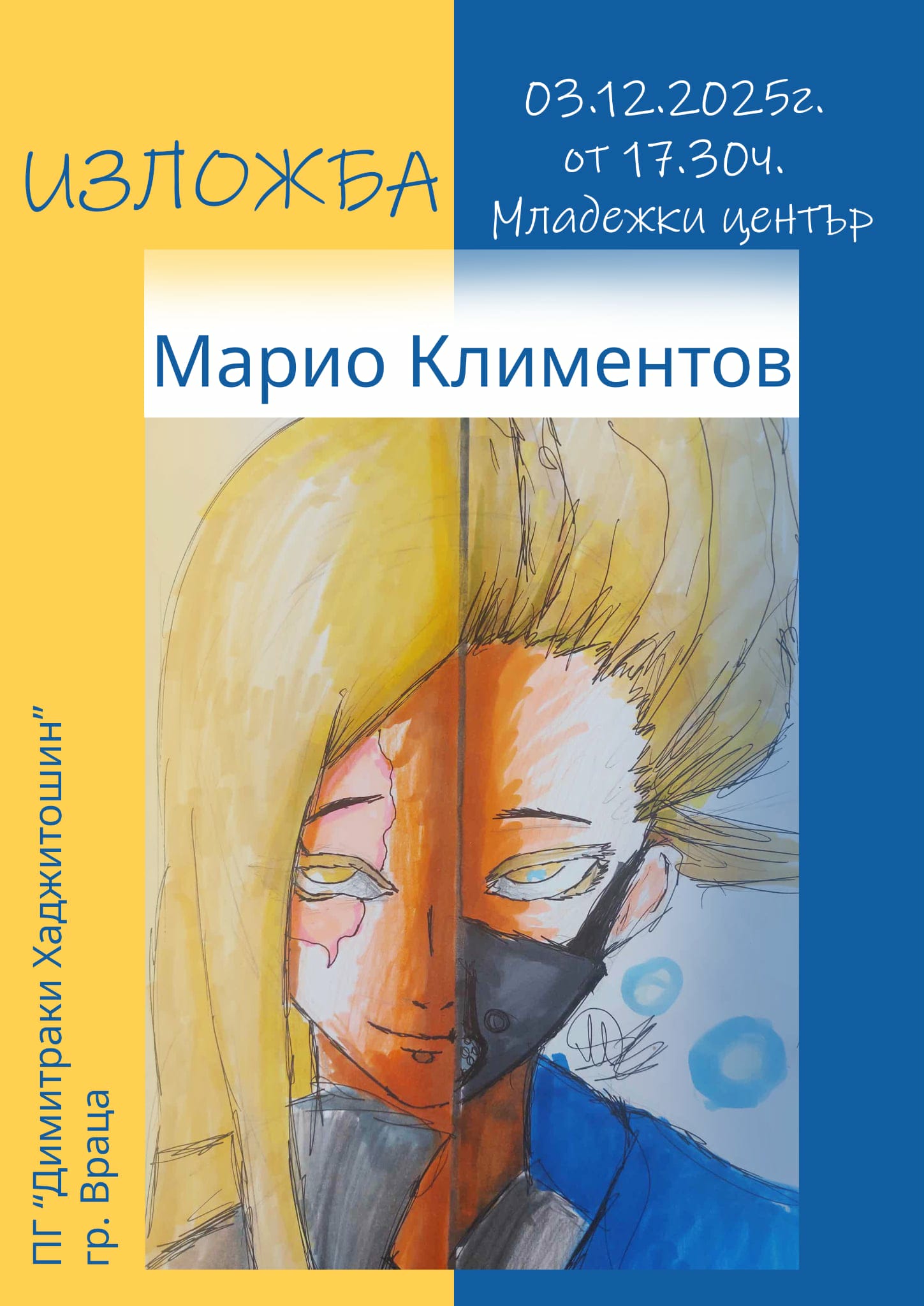 На 3 декември от 17.30 часа във фоайето на Младежки център-Враца Марио Климентов ще открие първата си самостоятелна изложба. Тя е със съдействието на ПГ “Димитраки Хаджитошин" и Младежки център - Враца.