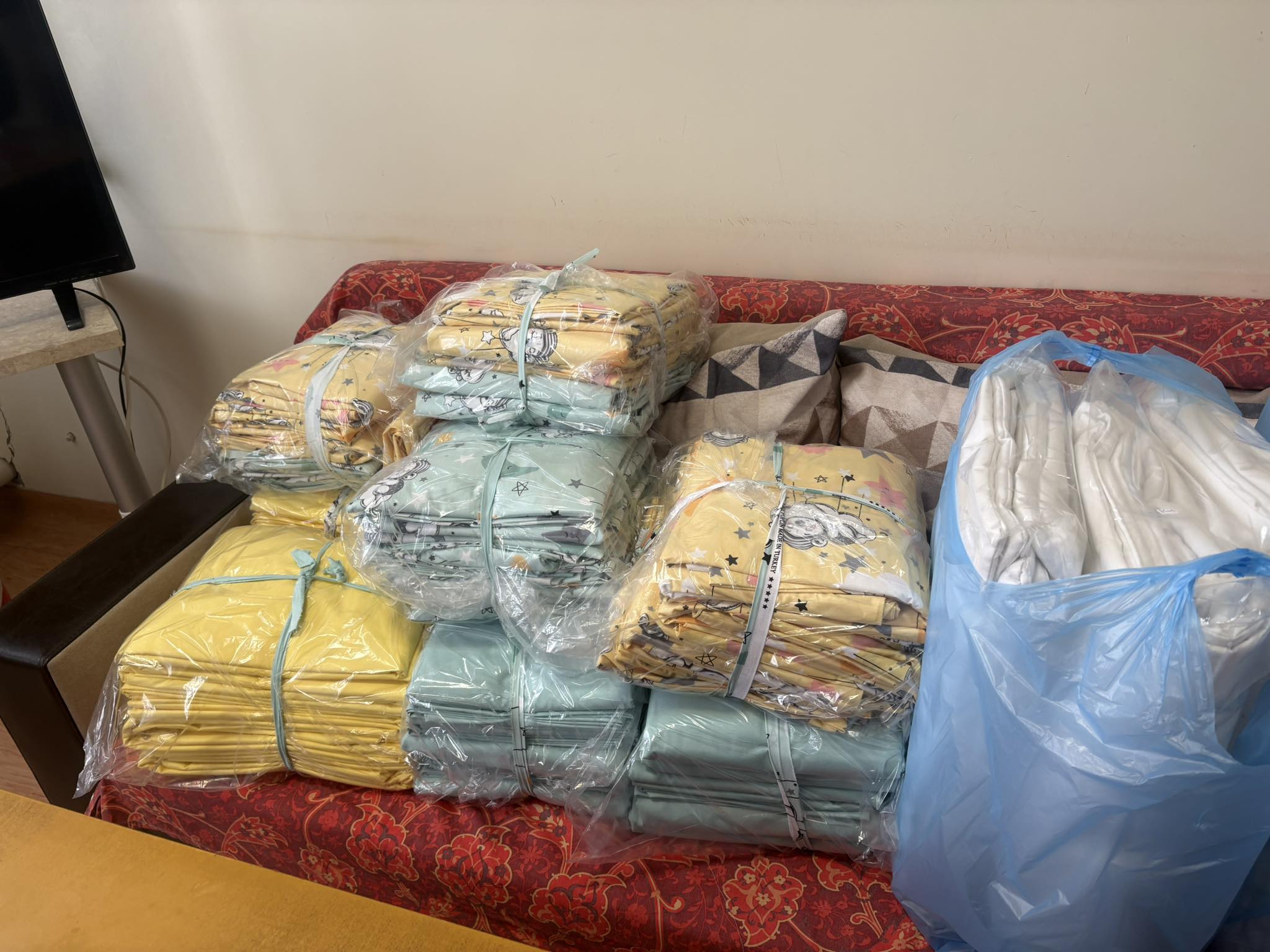 Дарението включва десетки спални комплекти, олекотени завивки, възглавници, термометри, стойки за системи и пакети с различни по размер памперси.