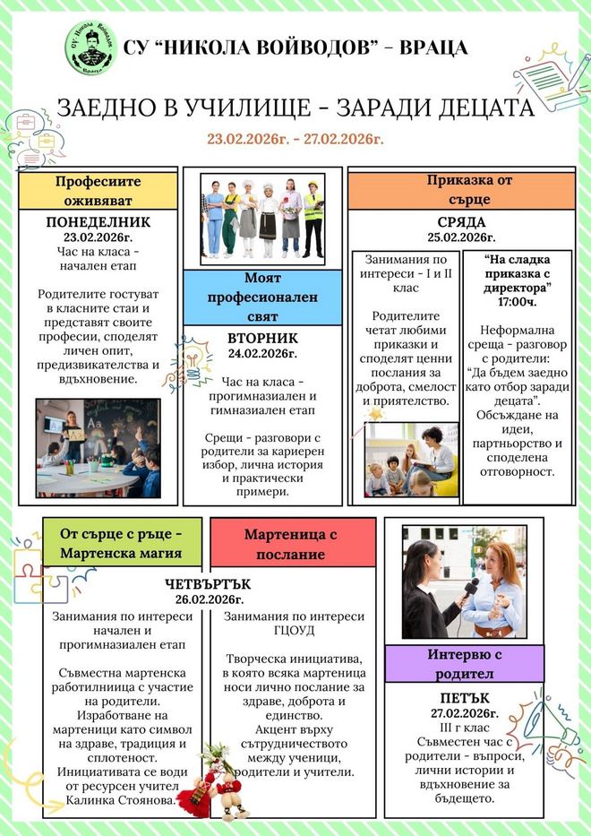 СУ „Никола Войводов“ във Враца се включва в регионалната инициатива на РУО „Заедно в училище – заради децата“. Проявата ще се състои от 23 до 27 февруари. Учебното заведение отваря широко вратите си за родителите, за разговорите, за споделените преживявания и за истинското партньорство. В програмата ни са включени „Професиите оживяват“ – родители представят своите професии и вдъхновяват учениците. „Моят професионален свят“ – срещи и разговори за кариерен избор и „Приказка от сърце“, където родители ще четат любими приказки. Ще се състои и неформална среща с директора на учебното заведение Гергана Иванова-Костова „Да бъдем заедно като отбор заради децата“. В периода ще се проведат и съвместни творчески инициативи - „Мартенска магия“ и „Мартеница с послание“. Като финал на проявата се проведе и интервю с родител, където ще бъдат представени лични истории и вдъхновение.