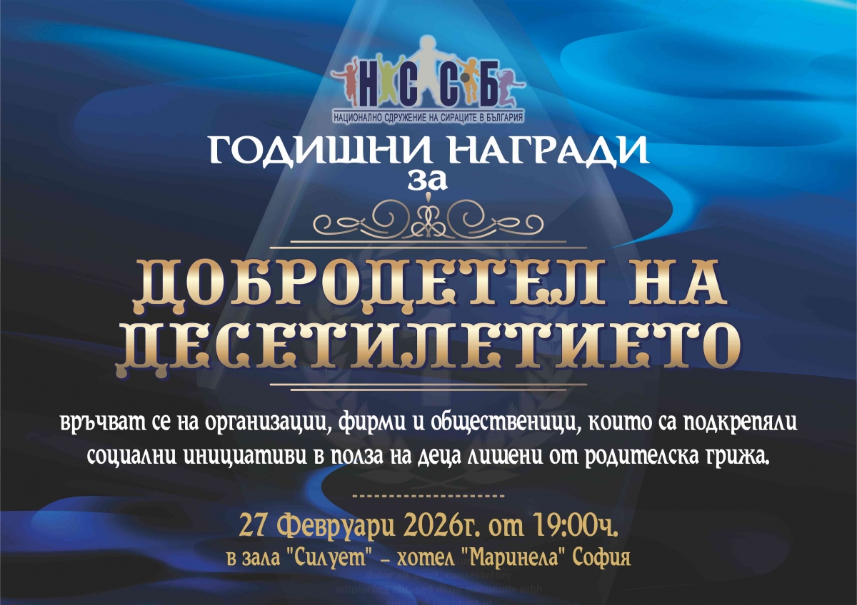 На 27 февруари в зала „Силует“ на столичния хотел "Маринела" от 19 часа над 90 организации, фирми и общественици ще бъдат отличени с почетното отличие за „Добродетел на десетилетието“ от Националното сдружение на сираците в България, съобщи председателят на управителния съвет на сдружението Слави Михайлов. Наградите се раздават за десета поредна година, заради приносът и активна подкрепа в различни социални инициативи на Сдружението, които са реализирани през изминалите десет години в полза на деца и младежи, лишени от родителска грижа в страната.