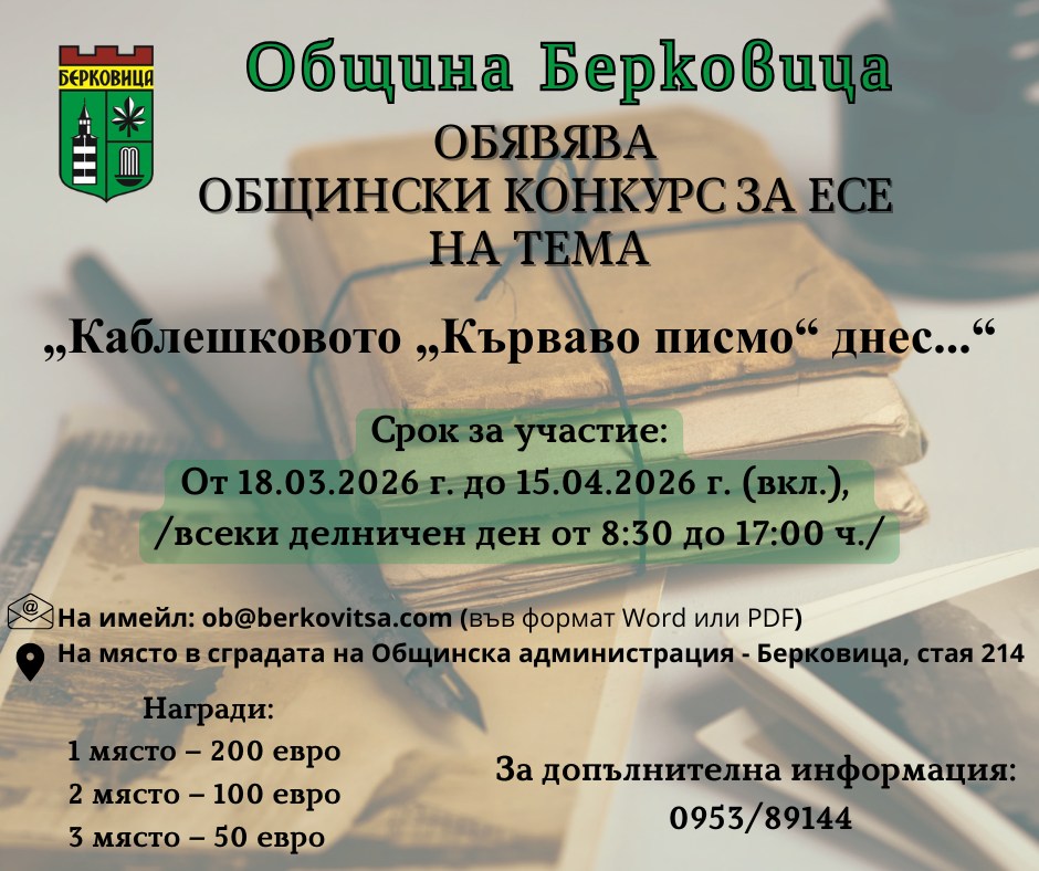 По повод 150 години от Априлското въстание, Община Берковица кани всички жители да вземат участие в конкурс за есе на тема „Каблешковото „Кърваво писмо“ днес...“.