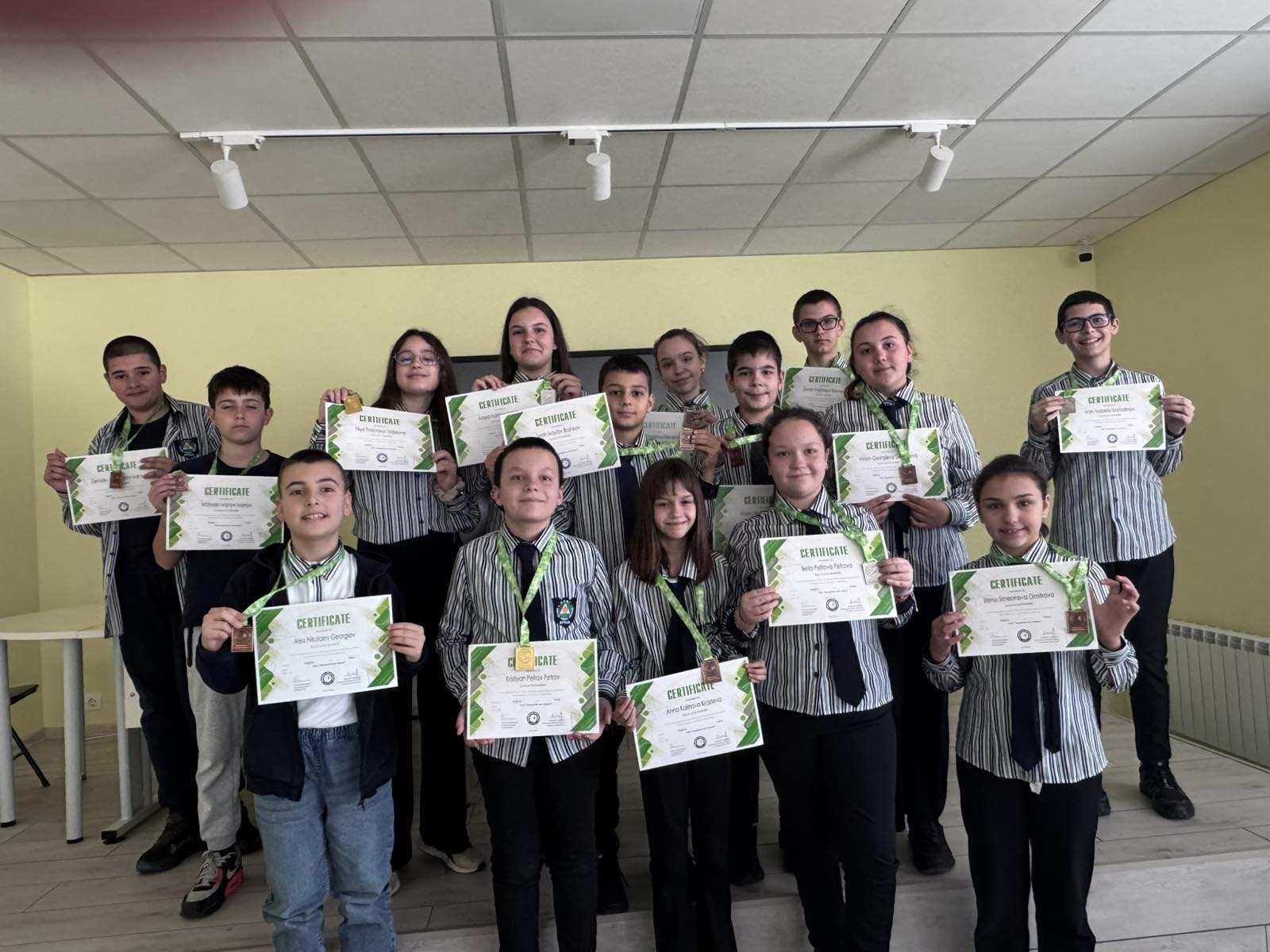 Златните медалисти и първенци в своите категории са Кристиян Петров Петров – V клас, Ния Тодорова Тодорова – VI клас и Даниел Владимиров Коловски – VII клас. Със сребърни отличия се завърнаха Белла Петрова Петрова – V клас, Иван Тодоров Костадинов – VI клас и Ивайла Иванова Иванова – VI клас, а бронзовите медалисти са Вивиан Георгиева Георгиева – V клас, Матей Малинов Манчев – V клас, Анна Калинова Кръстева – V клас, Алекс Николаев Георгиев – V клас, Ивелин Ивайлов Божков – V клас, Елена Симеонова Димитрова – V клас, Християн Иванов Иванов – VI клас, Денислав Цветомиров Иванов – VI клас и Ния Георгиева Шкетиева – VII клас.
