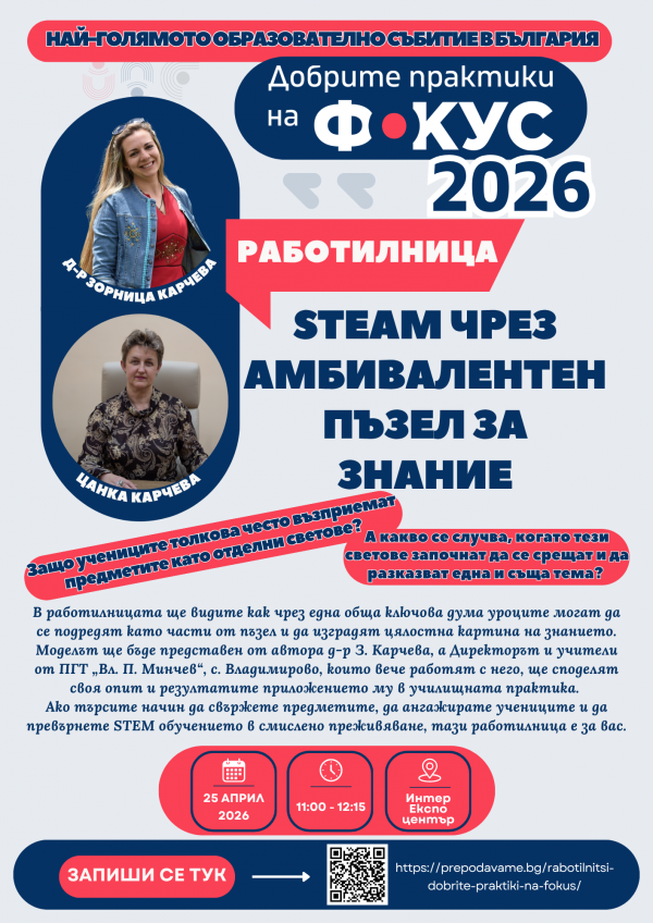 След представянето на концепцията моделът ще бъде демонстриран и на практика, като в работилницата ще се включат и учители от екипа на ПГТ „Вл. П. Минчев“, които ще покажат как „Амбивалентният пъзел за знание“ действа в реална учебна среда.