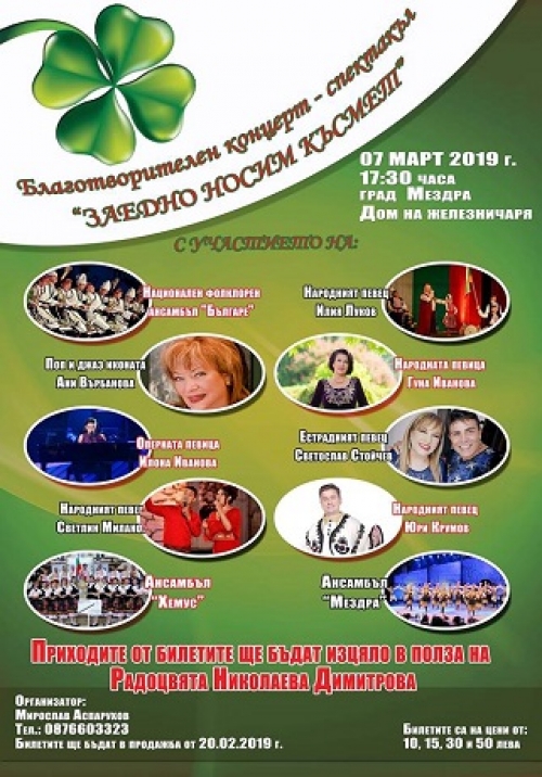 Благотворителен концерт- спектакъл в помощ на Радоцвята ще се проведе в Мездра. 38-годишната жена се бори с левкемия. Събитието е насрочено за 7 март от 17 и 30 часа в Дом на Железничаря. В концерта ще вземат участие Национален фолклорен ансамбъл "БЪЛГАРЕ"; Илия Луков; Ани Върбанова; Светлин Миланов; Ансамбъл " Хемус“; Юри Крумов; Илона Иванова; Светослав Стойчев; Гуна Иванова и Ансамбъл " Мездра.