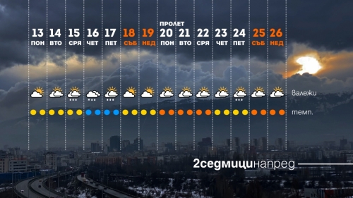 До края на астрономическата зима остава малко повече от седмица. Пролетта настъпва официално на 20 март вечерта. Времето в този период ще е често променливо, с много слънце, температури около и над 20 градуса, но и краткотрайни студени периоди с потенциал за снеговалежи. В понеделник и вторник призори температурите ще падат малко под нулата, но и двата дни ще са преобладаващо слънчеви. Живакът в първия ден от седмицата ще скочи до 15-16, а във вторник - до около 20. С преминаването на студен атмосферен фронт в сряда следобед от запад на изток ще започнат валежи от дъжд, които в четвъртък ще обхванат почти цялата страна. Ще се усили северозападният вятър и той ще е със силни студени пориви в Дунавската равнина и западните части на Горнотракийската низина. Ще се понижат температурите и в сряда вечерта, през нощта и в четвъртък ще има условия за снеговалежи – в планините на Западна и Централна България, по някои високи котловини в Западна България, в Предбалкана и с по-малка вероятност - в Лудогорието. Снегът ще е тежък и мокър, но ще се топи бързо. Нова снежна покривка до 10-15 см ще се образува само в планините. В петък ще остане облачно, а по-хладно и ветровито ще бъде в Източна България. Слънцето ще се върне за почивните дни, когато ще е тихо и приветливо, с температури около и над 15 градуса. Астрономическата пролет (20-21 март) ще настъпи с динамична облачност, без валежи и с подобаващи температури над 15 градуса, а на 22 март те ще скочат до над 20 градуса. Повишена вероятност от краткотрайни пролетни дъждове ще има около 24-25 март и след това – към самия край на месеца.