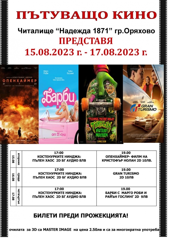 Билети за желания от Вас филм може да закупите преди прожекцията от касата в читалището.