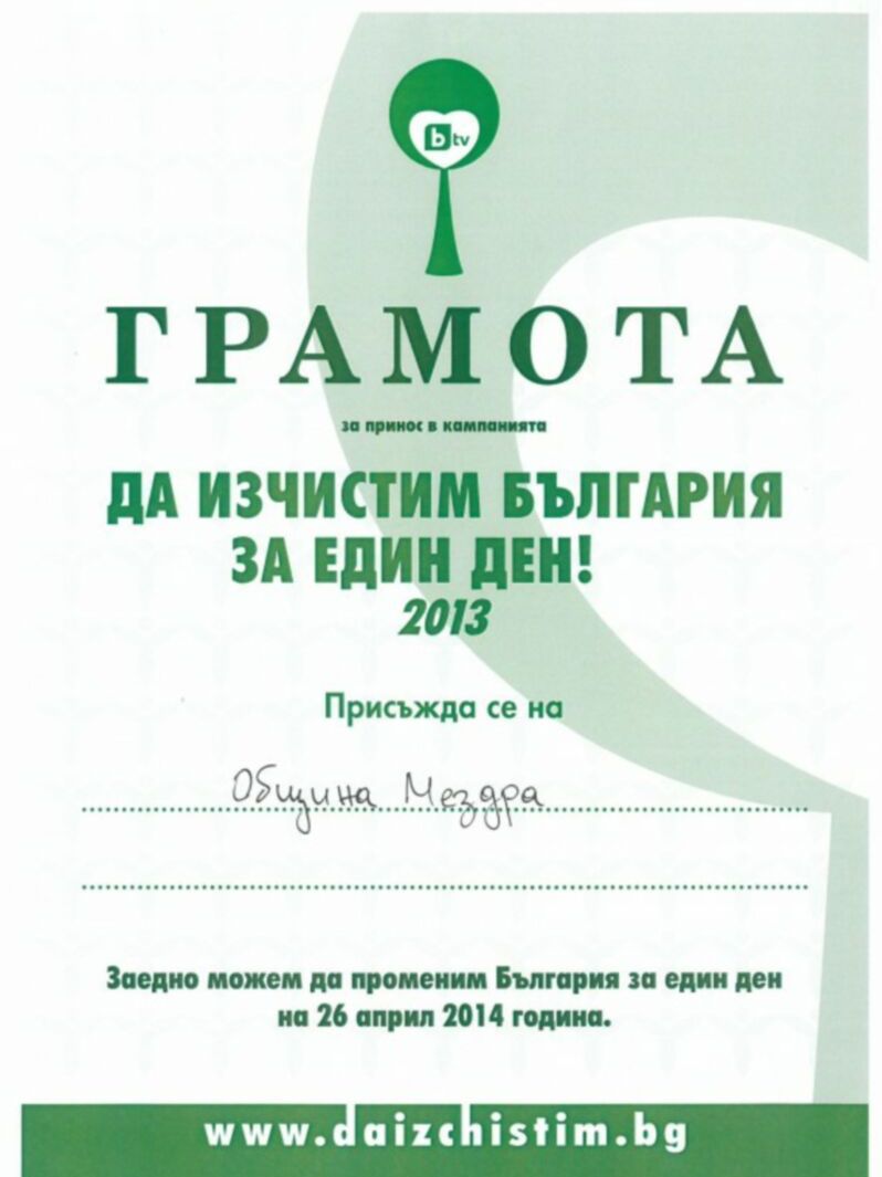 Община Мездра бе отличена с грамота за принос в миналогодишната Национална кампания „Да изчистим България за един ден”, която се проведе в цялата страна по инициатива на Би Ти Ви. Отличието получи на специална церемония във Враца инж. Галина Иванова, ст. специалист в Общинската екологична инспекция. Грамотата се дава за постигнати добри резултати и голяма активност в доброволната акция. Със събраните и извозени 77 тона твърди битови отпадъци Община Мездра се нарежда на второ място по количество сред 10-те общини в нашата област. Първа е Община Враца със 441 т., а трета – Община Мизия, с около 43 т.